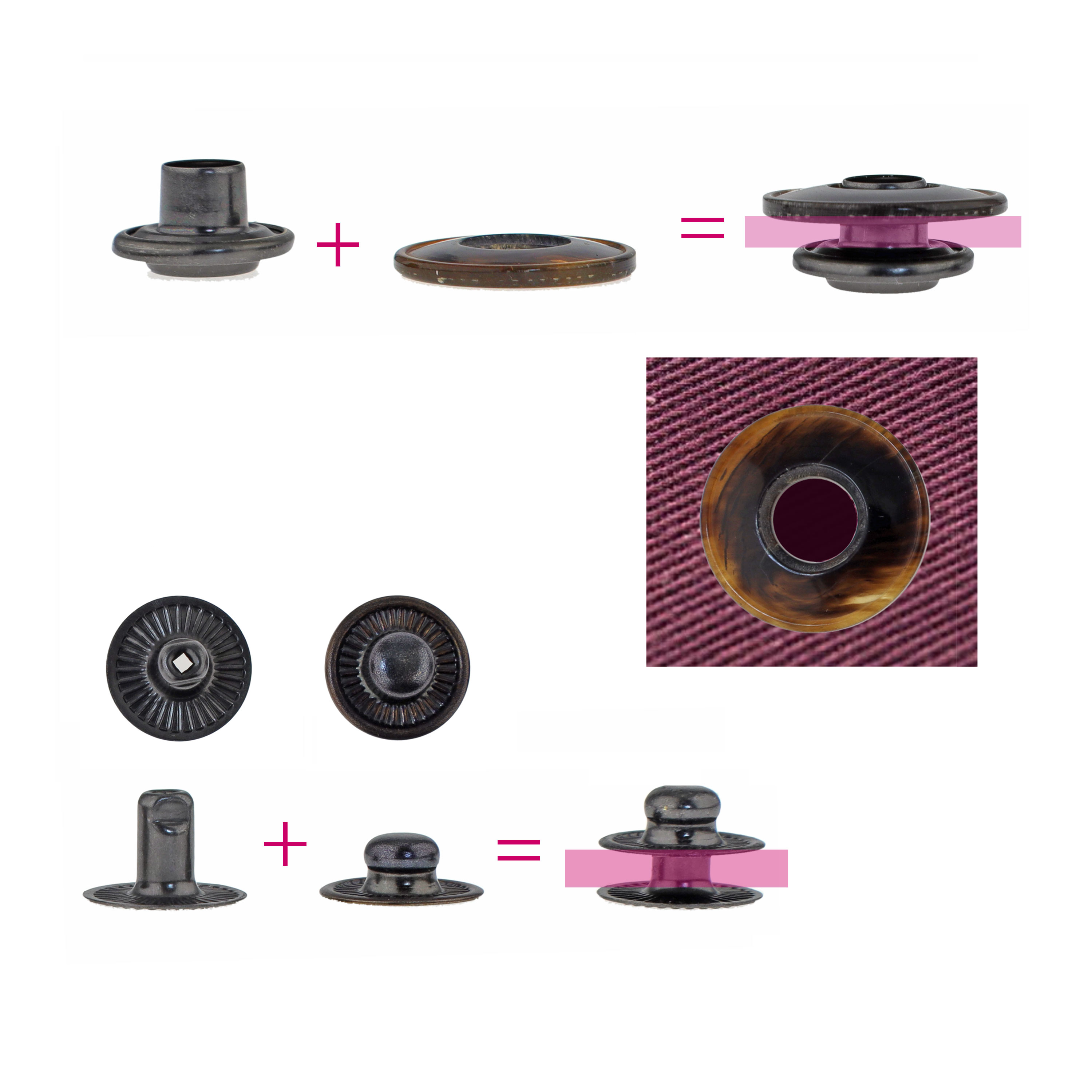 Kaunis iso rengasneppari. Oikealle puolelle jää ruskea sarvesta valmistettu rengas ja toiselle helmalle mustahattuinen ø12mm neppari. Pakkauksessa 4 nepparisarjaa.