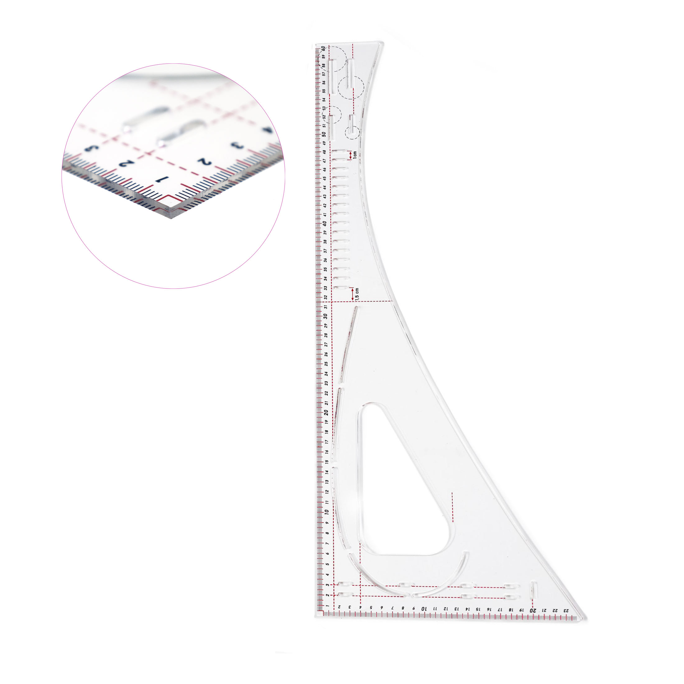 Klassikaline nurklekaal on valmistatud 3 mm paksusest läbipaistvast plastikust. Haarade pikkused: 25 cm x 60 cm. Skaala: cm. Skaala jaotus: mm